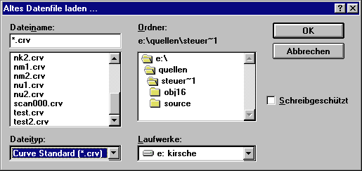 Eine in einer Datei abgelegter Linescan/Areascan (Formate '*.crv'/'*.psd') kann über den Hauptfenster-Menüpunkt 'Datei' -> 'Nachladen...' geladen und im Scanfenster dargestellt werden. Dieser Menüpunkt ist nur anwählbar, wenn ein Linescanfenster oder Areascanfenster geöffnet ist. Eine Auswahl der zu ladenden Datei geschieht über folgende Standard-Windows-Dialogbox.