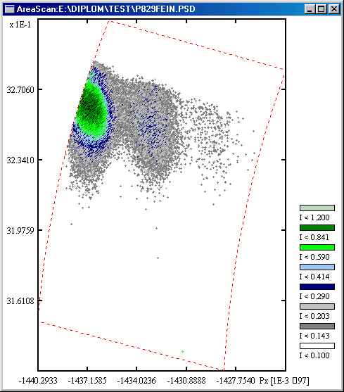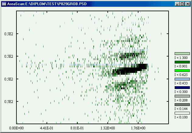 Dieses Bild ist fehlerbehaftet (Thetaoffset nur bei 1. Scankurve berücksichtigt, Achsbeschriftung und Legendenbeschriftung falsch - siehe Punkt 5. Fehler). Die Einstellung 'Raw Matrix' als Darstellungtyp bewirkt, daß im Areascanfenster die Roh-Daten-Matrix dargestellt wird.