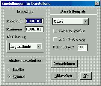 Bewirkt eine Übernahme der eingestellten Werte in der Dialogbox und veranlasst ein Neuzeichnen des Koordinatensystems und des dargestellten Intensitätsverlaufs, bei 'Neuzeichnen' bleibt das Dialogfenster geöffnet und bei 'OK' wird es geschlossen. Da unsinnige Kombinationen von Einstellungen schon während des Einstellvorgangs selbst ausgeschlossen werden, braucht hier nichts weiter überprüft zu werden.